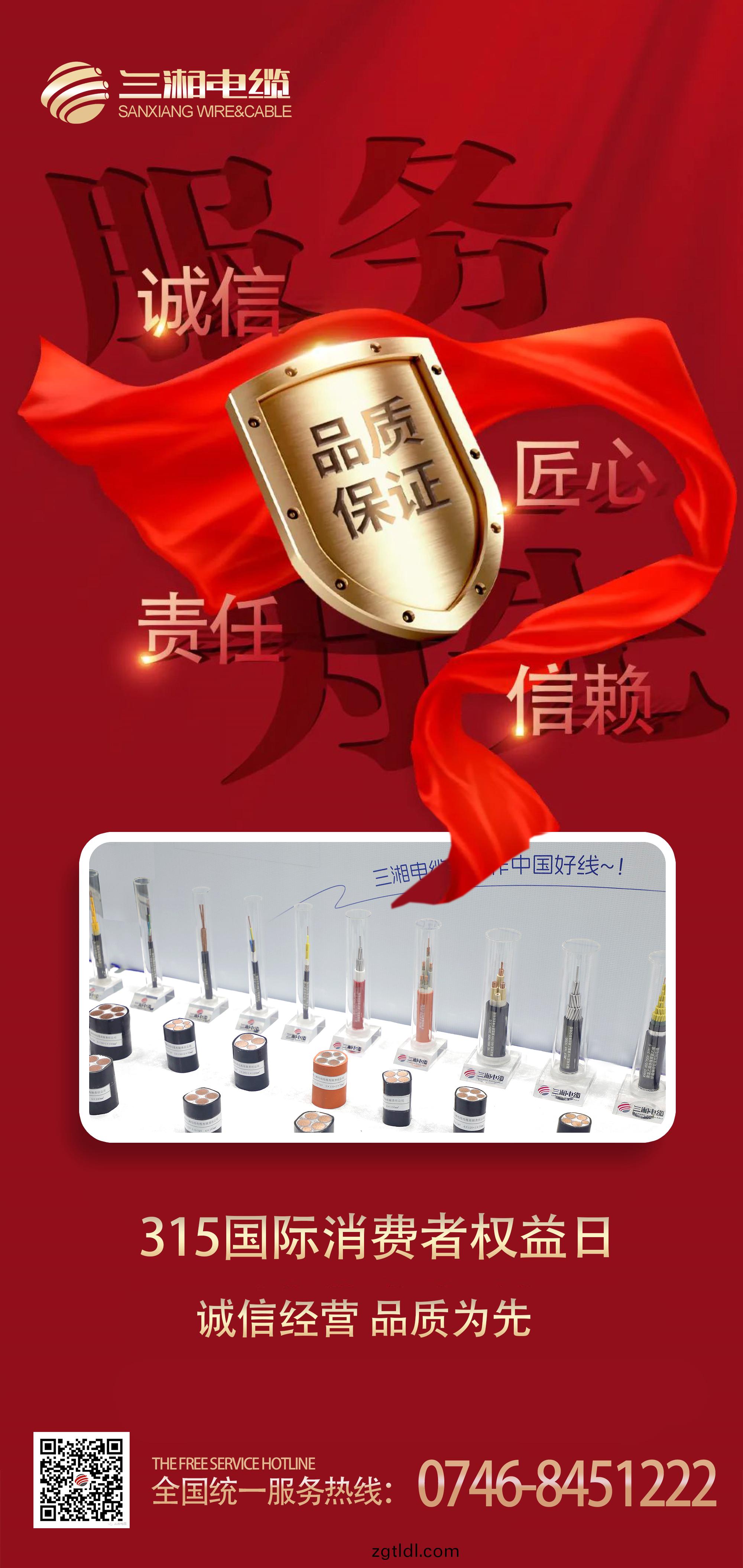 3·15消費者(zhe)權益日到了(le),誠信一直昰三(san)湘電纜自始至終堅守的使命與責任,作爲高品質電線電纜製造商,三湘電纜從1999年創立至今,25年來踐行(xing)誠信的態度(du)始終如一,堅持以高質量的産品品質保障消費者對線(xian)纜的需求,以“服務 品質 誠信 共贏”的(de)覈心髮展理唸贏得客戶的滿意與認可!